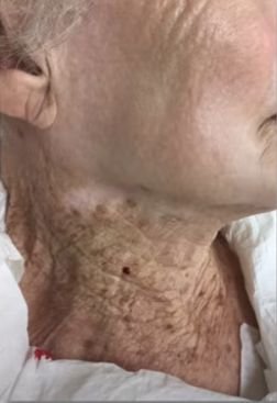 The 92-year-old woman’s photograph tells a stark story. Her face remains relatively smooth, while her neck shows deep wrinkles and age spots.